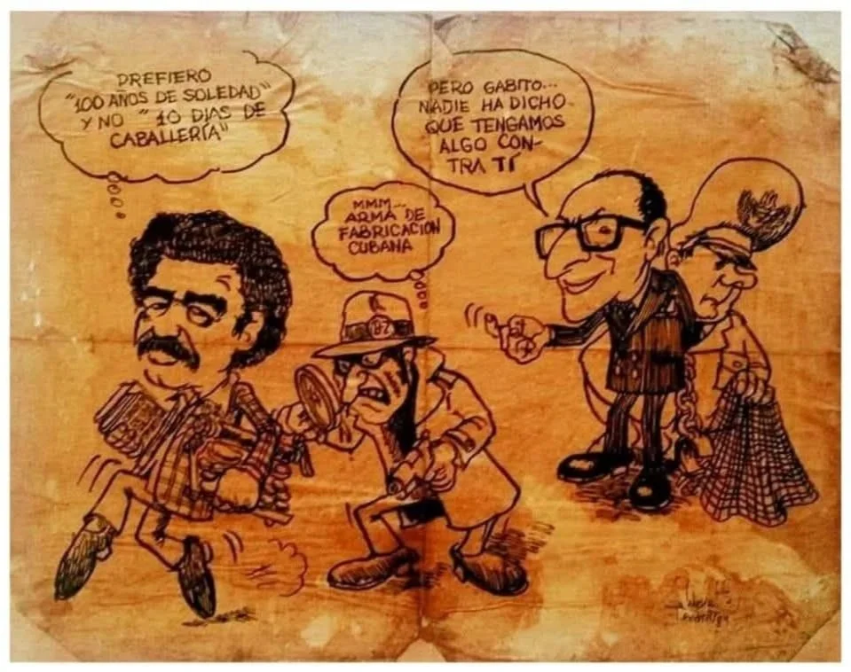 "El exilio de Gabo". Caricatura elaborada por Carlos Duplat Sanjuan. (La Picota, 1981). Gabriel García Márquez tuvo que irse de Colombia para evitar caer en manos de Julio César Turbay, cuyo gobierno lo acusaba de tener nexos con el M-19.