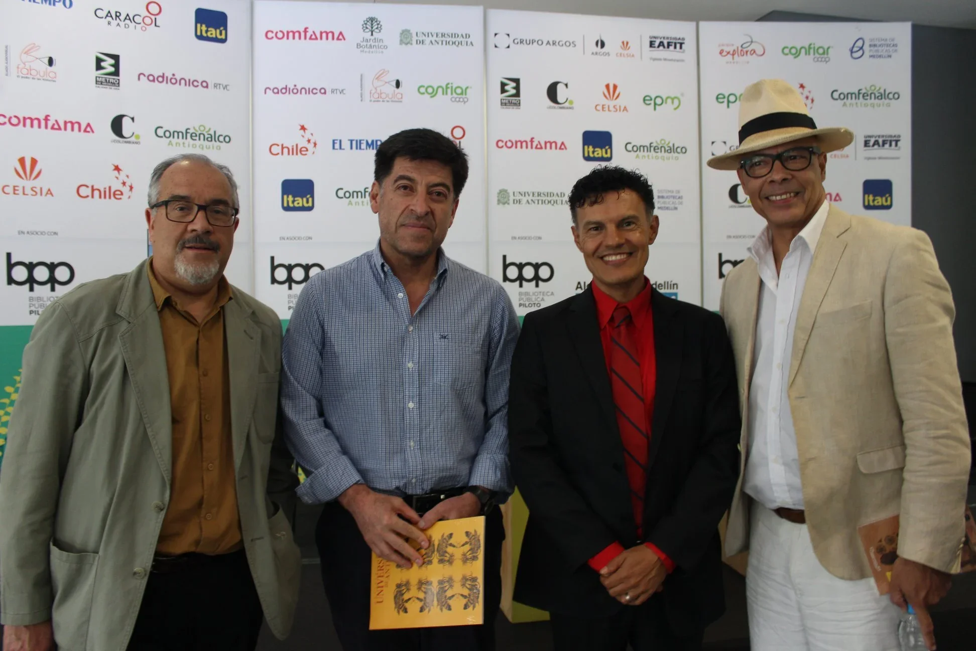 Gustavo Forero en compañía de los escritores Ramón Díaz Eterovic, Gonzalo Lema y Luis Pulido Ritter en el Congreso Internacional de Literatura Medellín Negro de 2019.